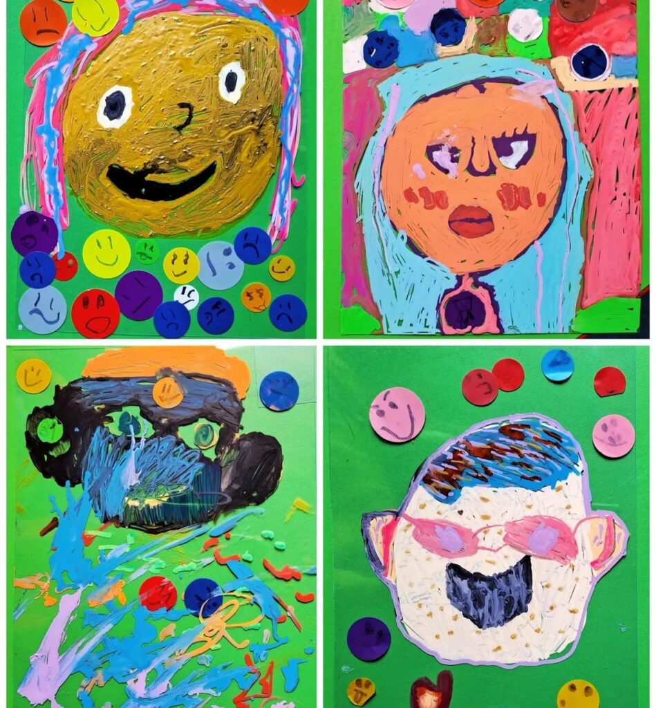 ID: Four colourful portraits using paint and smiley circles stuck on green background