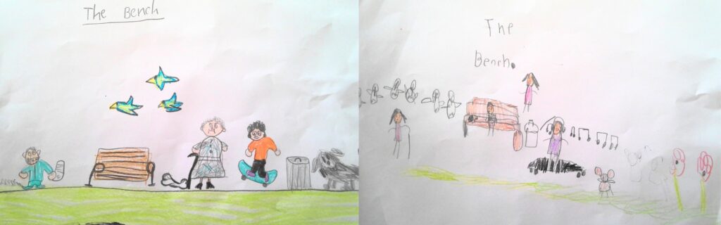 ID: two coloured pencil drawings of a bench drawn by children in a workshop