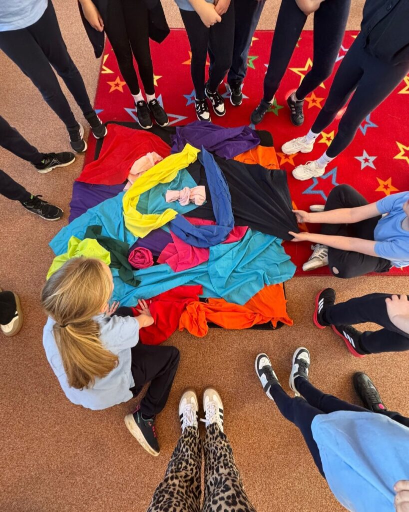 ID: kids standing in a circle, one child sitting on the floor with colourful fabric in the middle